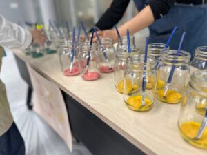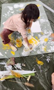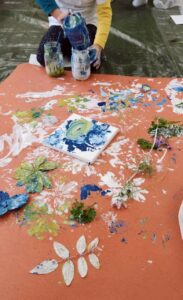 秋晴れの天気の中 参加の皆さんは、エア・ウォーターの森屋上ガーデンで育った植物を摘み えのぐでスタンプアート。